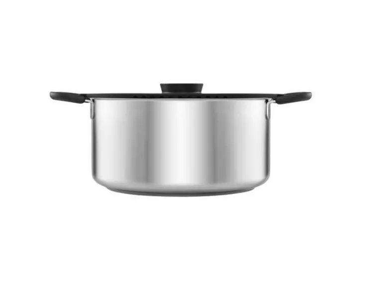 Szklana, płaska pokrywa z silikonowym brzegiem posiada dwie funkcje odcedzania i odlewania.