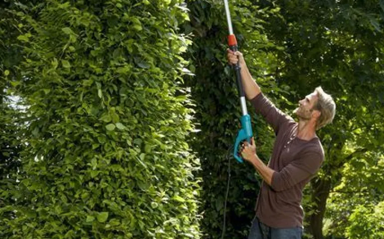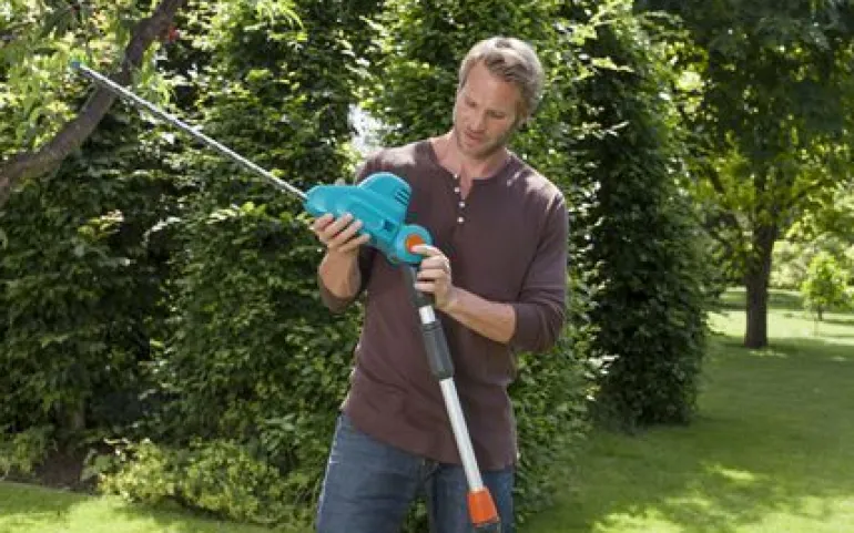 Dzięki elektrycznym nożycom do żywopłotu z trzonkiem teleskopowym przycinanie wyższych żywopłotów nie stanowi problemu. Regulowany trzonek teleskopowy sprawia, że można nadać żywopłotowi idealny kształt, stojąc bezpiecznie na ziemi. Głowicę tnącą nożyc można obrócić, by ustawić ostrze we właściwej pozycji roboczej. Dzięki temu w wygodny i precyzyjny sposób przytniemy żywopłoty bez konieczności wchodzenia na drabinę. Również klękanie nie jest już konieczne, gdyż równie wygodnie, na stojąco, można przycinać rośliny płożące.