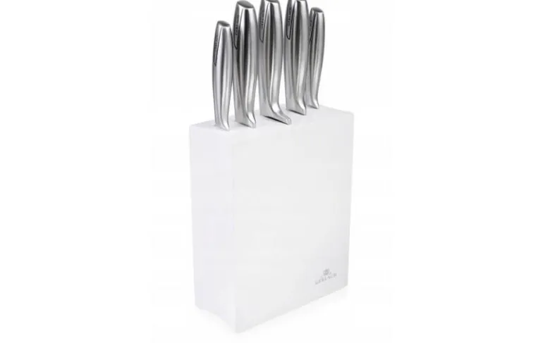 Komplet noży dostępny jest z eleganckim blokiem z lakierowanego drewna bukowego w dwóch wariantach kolorystycznych – białym lub czarnym. Postawiony na blacie będzie delikatną ozdobą w kuchni.