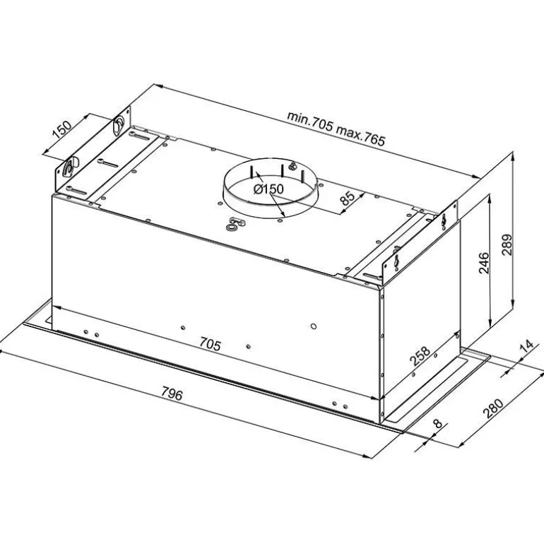 Klasa energetyczna B, do zabudowy, szer. 79,6 cm, gł 28 cm, sterowanie sensorowe (dotykowe) z wyświetlaczem LED, zakres prędkości: 3 + boost, wydajność max. 565 m 3/h, głośność min. 48 dB, wykonanie: stal lakierowana na kolor czarny, oświetlenie pasek LED 10 W . Linia GLOBALO Design