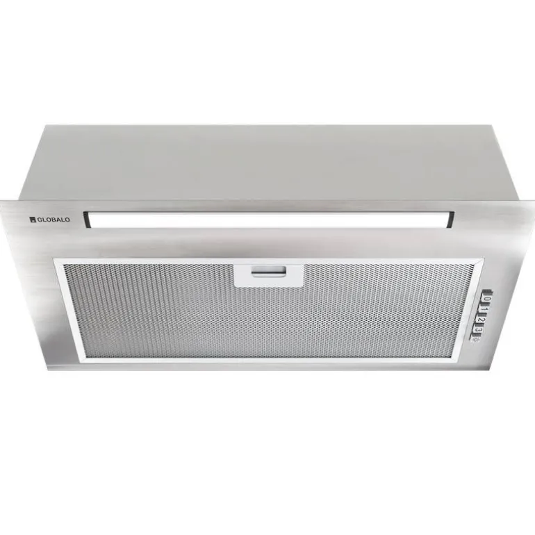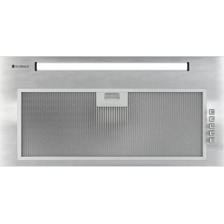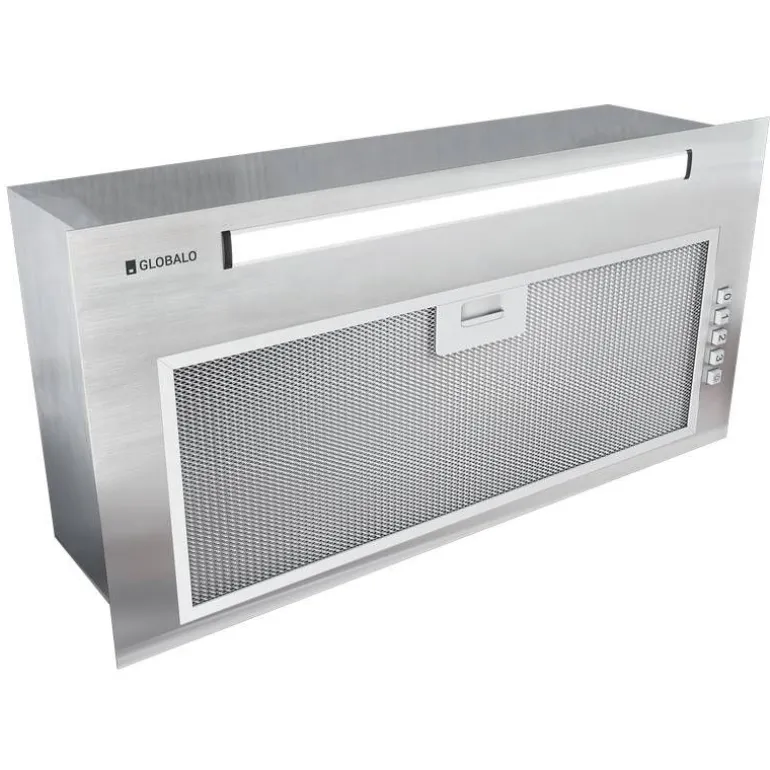 Klasa energetyczna C, do zabudowy, szer 59,8 cm, gł 29 cm, sterowanie push-button, zakres prędkości: 3, wydajność max. 415 m 3/h, głośność min. 49 dB, wykonanie: stal szlachetna inox, oświetlenie pasmo LED 4W. Linia GLOBALO Design