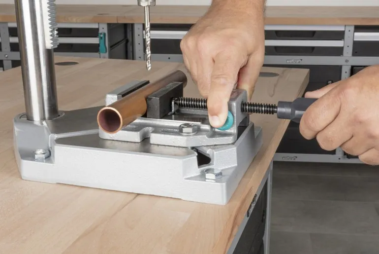 – stalowe szczęki z poziomym i pionowym rowkiem V do pewnego mocowania przedmiotów okrągłych