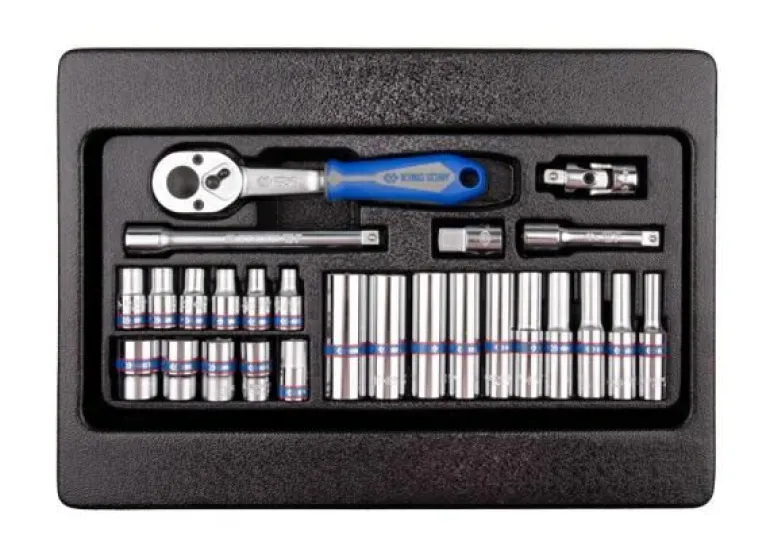 KING TONY ZESTAW NASADEK 1/4 26cz. KRÓTKIE / DŁUGIE. 6-kąt. 4 – 13mm Z AKCESORIAMI. WKŁAD DO WÓZKA