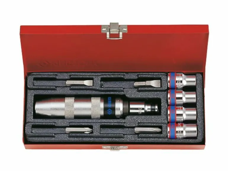 Komplet narzędzi 1/2″ wraz z wkrętakiem udarowym firmy King Tony. W zestawie znajdują się 4 nasadki 6-kątne: 8, 10, 12, 14mm, krótkie bity płaskie 9, 11 oraz krzyżakowe 2, 3, uchwyt do bitów oraz wkrętak udarowy