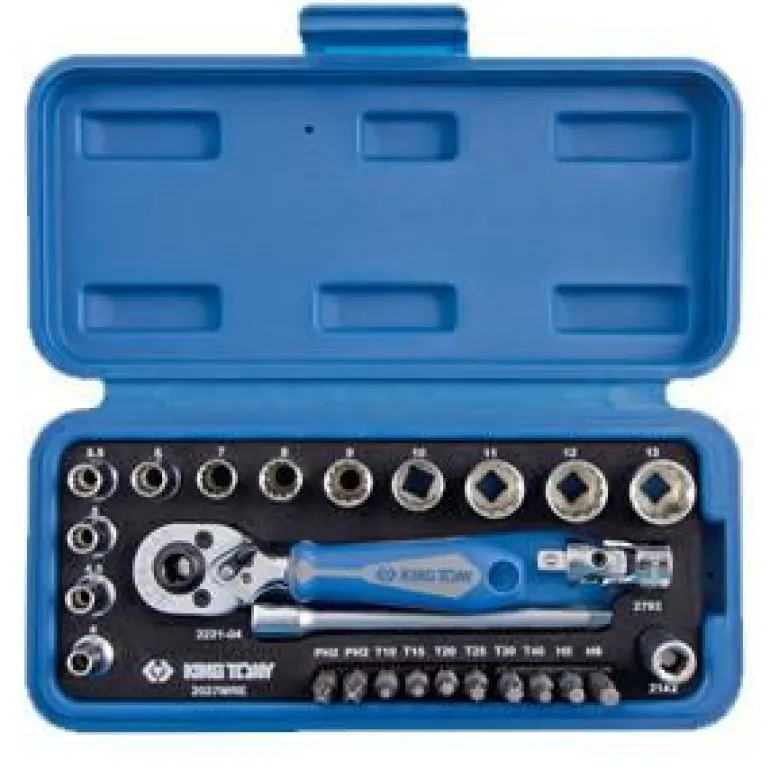 KING TONY ZESTAW NARZĘDZI 1/4" 27cz. NASADKI KRÓTKIE, 12-kąt. 4 – 14mm Z GRZECHOTKĄ I AKCESORIAMI
