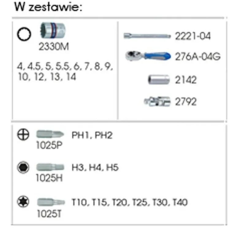 – nasadki 2330M krótkie 12-kątne 1/4″ w rozmiarach: 4, 4,5, 5, 5,5, 6, 7, 8, 9, 10, 12, 13, 14