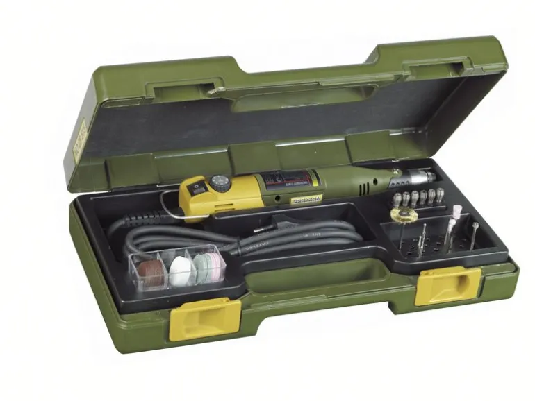 Dzięki średnicy zaledwie 37 mm i wadze tylko 270 g zapewnia wygodną obsługę, która nie ma sobie równych w swojej klasie! Specjalny, zrównoważony silnik prądu stałego. Cichy i niezwykle trwały. Elektroniczna regulacja prędkości od 6000 do 22 000 obr./min. Szlifowane wrzeciono z łożyskami kulkowymi. Wysokiej jakości stalowe tuleje zaciskowe MICROMOT: nawet najdrobniejsze elementy znakomicie spasowane. Wysoka kultura pracy – brak grzechotania i wibracji. Łatwa wymiana osprzętu przy pomocy jednego przycisku. Standardowy kołnierz 20 mm jest spasowany z resztą osprzętu MICROMOT jak np. stojaki wiertnicze. Zawiera 34 końcówki i frezy o jakości przemysłowej, 6 stalowych tulei zaciskowych MICROMOT (po 1 1 – 1,5 – 2 – 2,4 – 3 i 3,2 mm). Wszystko ergonomicznie rozmieszczone w atrakcyjnej plastikowej walizce.
