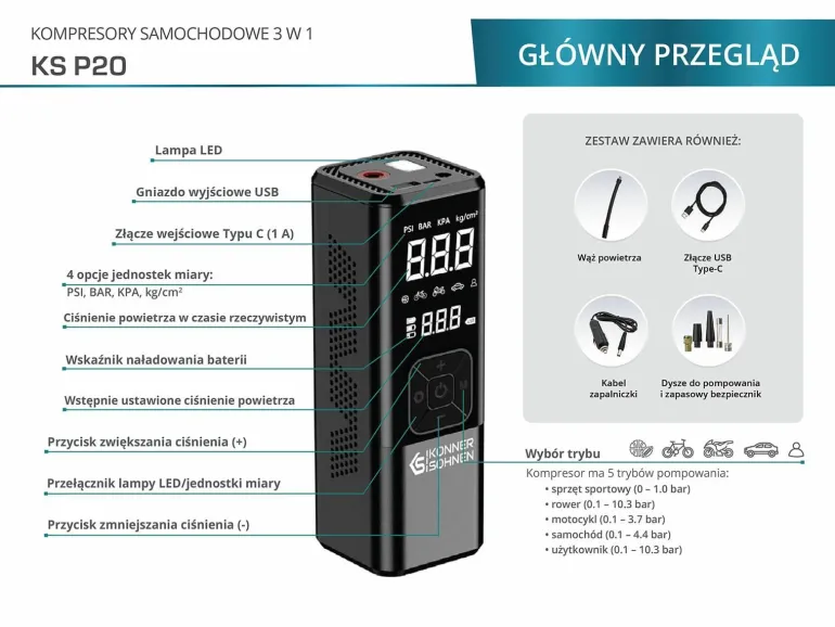 Samochodowy kompresor KS P20 z funkcją powerbanku od Könner & Söhnen® to niezawodny pomocnik do pompowania wszelkiego rodzaju kół (samochodowych, motocyklowych, rowerowych, kół wózków dziecięcych, ogrodowych czy taczek budowlanych itp.), a także przyda się właścicielom sprzętu sportowego, nadaje się do piłek, materacy nadmuchiwanych, zabawek wodnych, kamizelek i innych nadmuchiwanych wyrobów.
