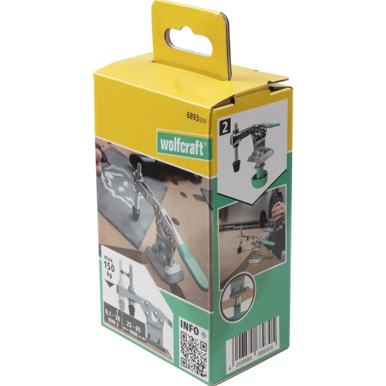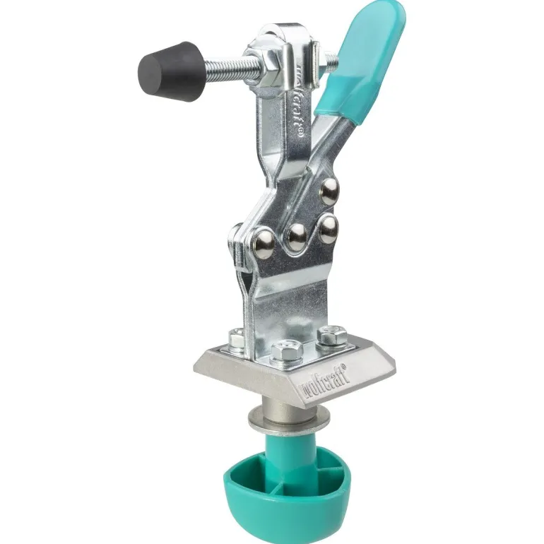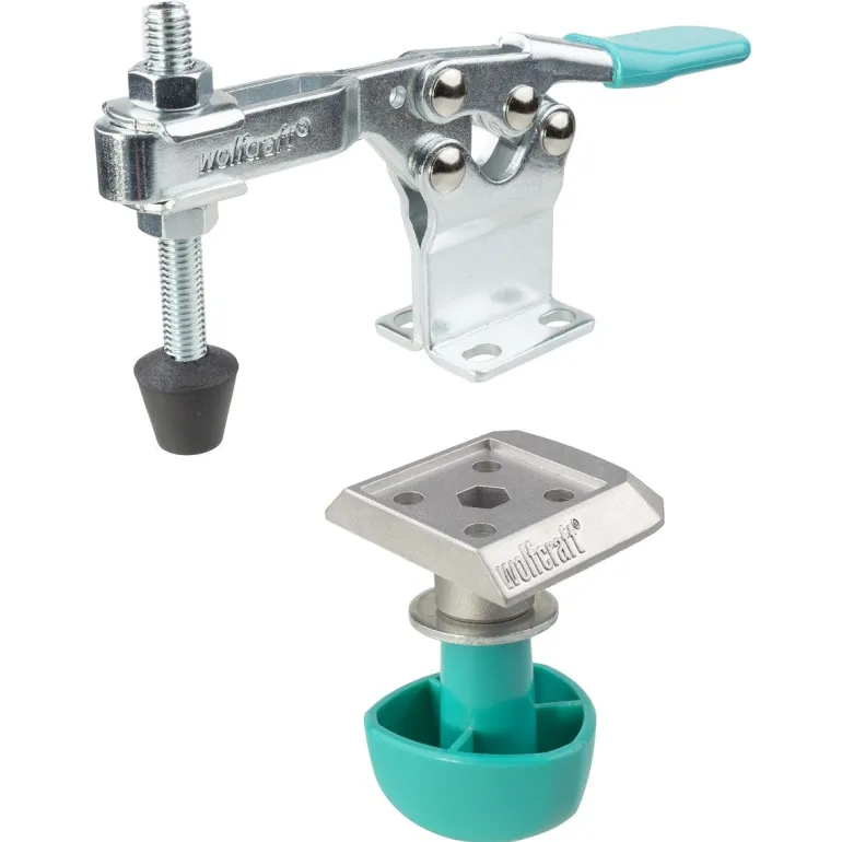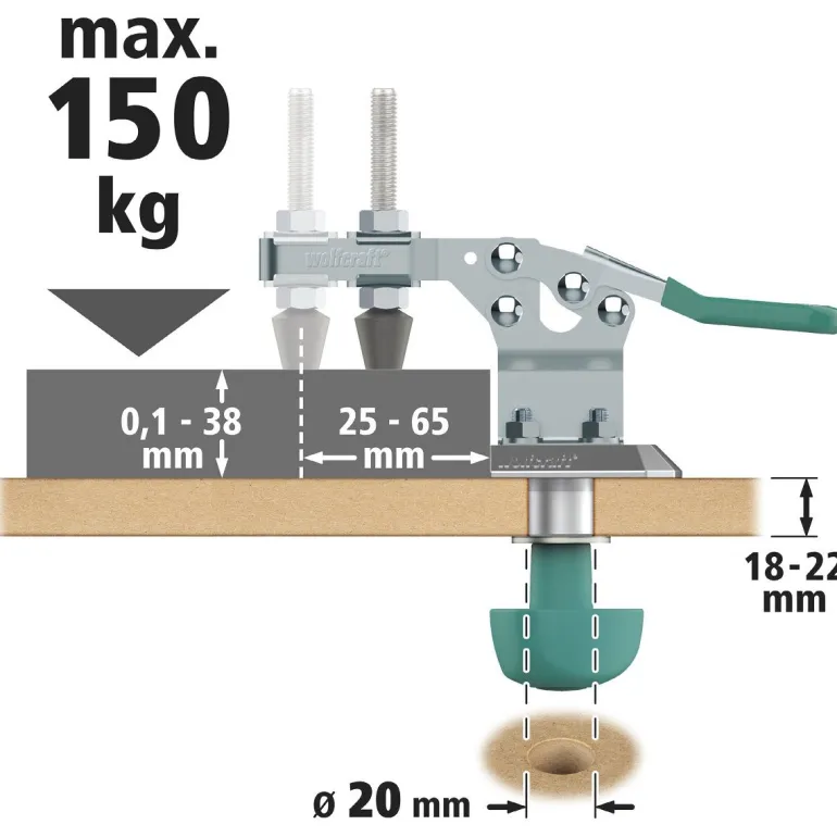 Mobilny zacisk szybkomocujący wykonany ze stali jest idealny do wszystkich projektów wymagających bezpiecznego zamocowania i pracy z obrabianym przedmiotem. Ścisk można zablokować w ciągu kilku sekund za pomocą odlewanej ciśnieniowo aluminiowej płyty adaptera we wszystkich stołach z otworami 20 mm. W tym celu wystarczy wpiąć i dokręcić śrubę pod blatem roboczym. Ergonomiczny uchwyt zapewnia wykonanie tej czynności szybko, bezpiecznie i wygodnie. Dzięki takiemu zamocowaniu uzyskamy siłę docisku do 150 kg. Mobilny zacisk szybkomocujący jest idealny do prac seryjnych. Alternatywnie można również zdjąć płytę adaptera i przykręcić mobilny zacisk bezpośrednio do blatu roboczego za pomocą czterech śrub. Zakres zacisku od 0 do 38 mm możemy płynnie regulować przy użyciu trzpienia gwintowanego w zależności od grubości obrabianych przedmiotów. Dzięki obszarowi wysięgu od 25 do 65 mm umożliwia wszechstronne zastosowanie do wielu zadań związanych z zaciskaniem. Dla optymalnego chwytu, obsługa odbywa się za pomocą dźwigni zaciskowej pokrytej gumową powłoką niezawierającą PVC. Trzpień dociskowy wykonany jest z tworzywa NBR wysokiej jakości, które zapewnia bezpieczne dla powierzchni i antypoślizgowe mocowanie obrabianego przedmiotu.