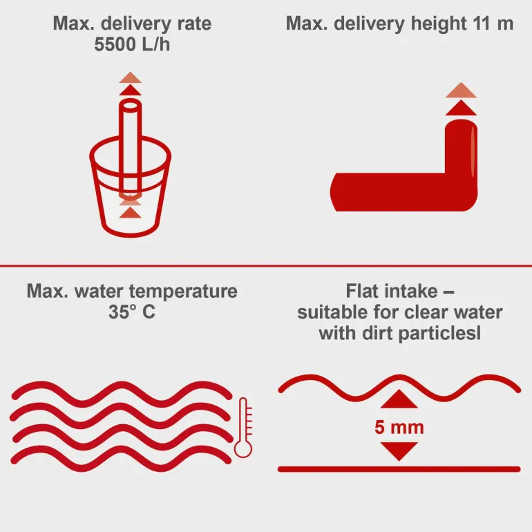 - Bezpieczeństwo: Pływakowy wyłącznik chroni pompę przed suchobiegiem, zapewniając bezpieczne użytkowanie.