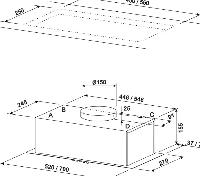 Okap do pełnej zabudowy, podszafkowy min. szerokość szafki 30 cm. Występuje w dwóch rozmiarach 52 oraz 70 cm. Oświetlenie – dwa okrągłe światła LED o mocy 3 W każde. Neutralna barwa światła. Sterowanie przyciskowe. Możliwość korzystania z okapu jako wyciąg jak i pochłaniacz.