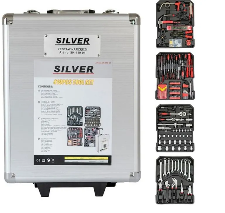 Zestaw narzędzi Silver liczący 419 elementów. Całość umieszczona w wygodnej walizce z wysuwaną rączką ułatwiającą transport.