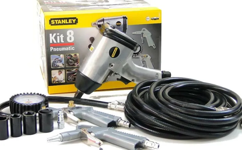 Bardzo praktyczny i przydatny zestaw narzędzi pneumatycznych/ lakierniczych STANLEY, całość zestawu to 8 elementów.