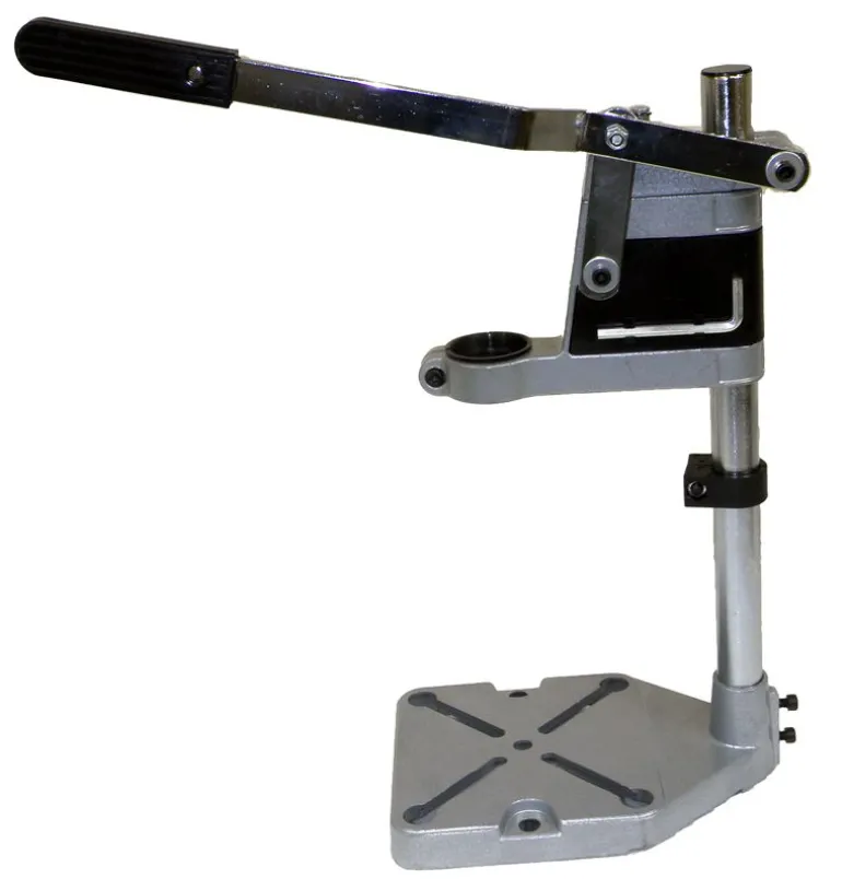 Statyw do wiertarki fimy Silver. Umożliwia pionową zmianę położenia zamocowanej wiertarki, dzięki temu stabilna praca zmniejsza prawdopodobieństwo złamania lub uszkodzenia wiertła. Doskonałe urządzenie do precyzyjnego wiercenia otworów w różnych materiałach. Korpus wykonany jest z aluminium, dzięki czemu całość jest lekka i wytrzymała. Obsługa zamocowanej wiertarki sprowadza się do sterowania dźwignią sprężynującą umożliwiającą samoczynny powrót wiertarki do pozycji wyjściowej.