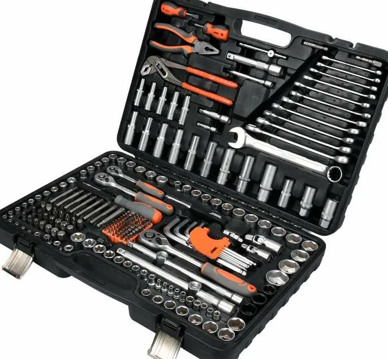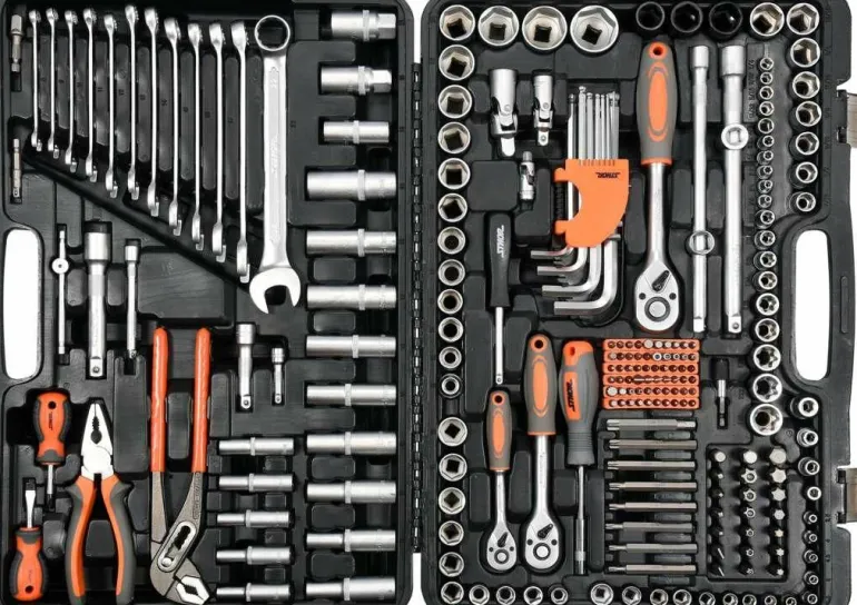 W zestawie znajdziemy pełen zakres nasadek 1/4″,1/2″ oraz 3/8″, przedłużek, przegub Cardana i wiele innych elementów, włącznie z grzechotkami o 45 zębach.