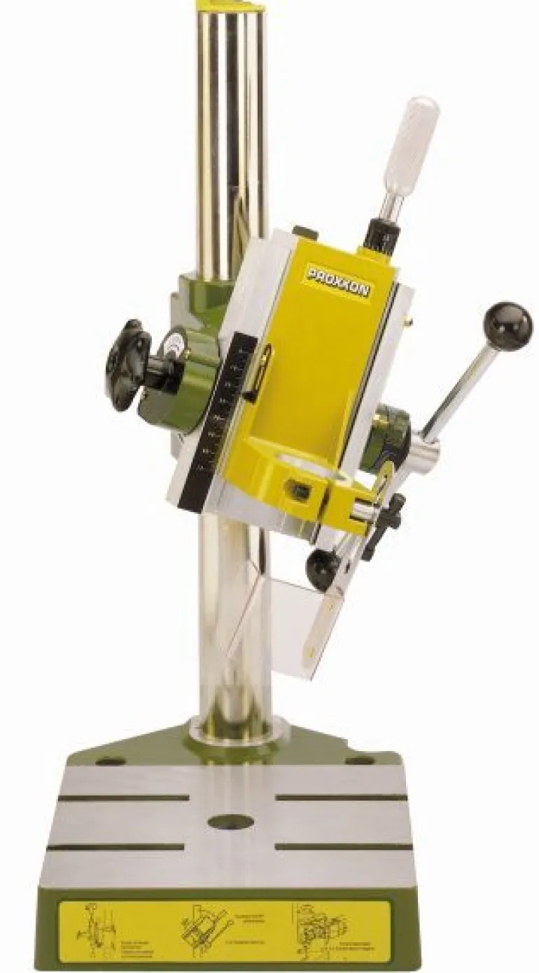 Do standardowych narzędzi z 43-milimetrową szyjką wrzeciona. Głowica może być odchylana do 90°. Do różnych rodzajów obróbki: wiercenia pod kątem, wielostronnego frezowania bez specjalnych frezów, frezowania pod kątem. Możliwość zmiany posuwu manualnego na precyzyjny. Ustawianie głębokości przy pomocy tarczy z podziałką. Mechanizm zębatkowy posuwu zapewnia wiercenie bez wysiłku. Kolumna o średnicy ok. 45 mm i długości 500 mm.Wysięg około 140 mm (pomiędzy prowadnicą i środkiem narzędzia). Skok 65 mm. Frezowana, wytrzymała podstawa o wymiarach 200 x 200 mm z rowkami teowymi zgodnie z normą MICROMOT (12 x 6 x 5 mm). Bez dodatkowego wyposażenia można stosować wiertarki o średnicy szyjki 43 mm. Waga 6,5kg.