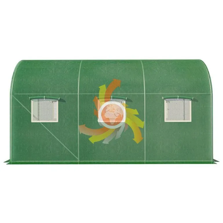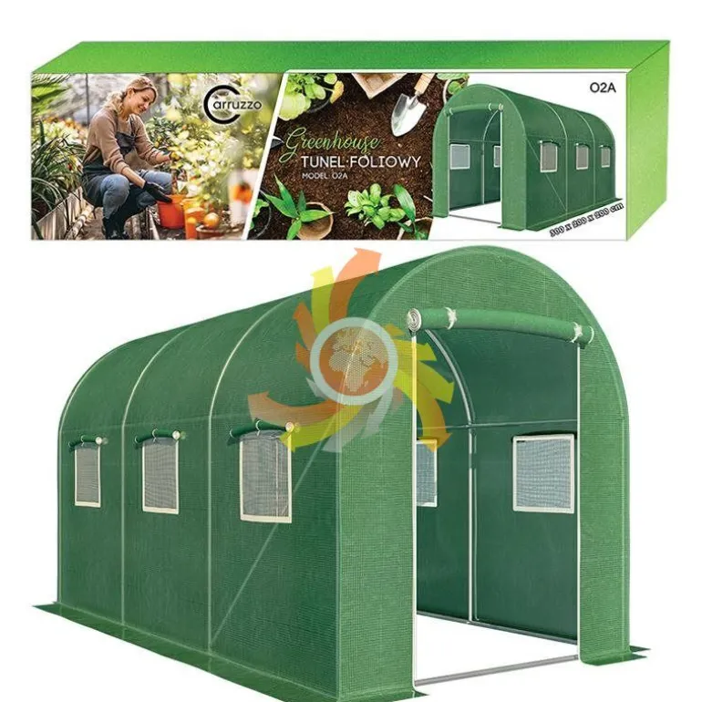 Ogrodowy tunel foliowy, zapewnia optymalną ochronę upraw, wydłuża sezon owocowania, pozwala podnosić wydajność zbiorów. Stelaż wykonany ze stalowych, obustronnie ocynkowanych profili. Montaż za pomocą śrub zapewnia o stabilności i wytrzymałości konstrukcji. Przezroczysta, warstwowa folia PE 140g/m2 . Zamykane okna z moskitierami umożliwiają dopływ świeżego powietrza oraz kontrolowanie poziomu wilgotności. Tunel wyposażono w szerokie, rolowane drzwi z zamkiem. Wysokość szklarni (200 cm) pozwala na swobodne poruszanie się i wykonywanie prac.