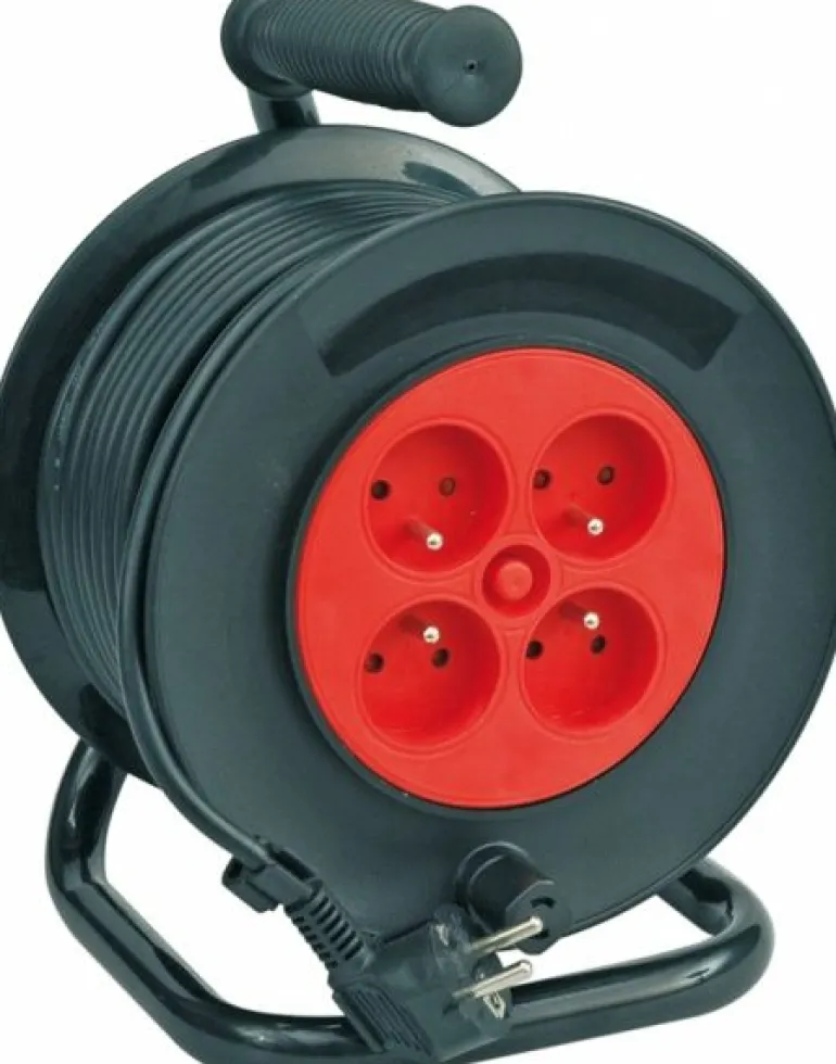 Przedłużacz bębnowy wyposażony w metalowy stelaż, na który nawinięty jest przewód o średnicy 1,5 mm2 (3-żyłowy).