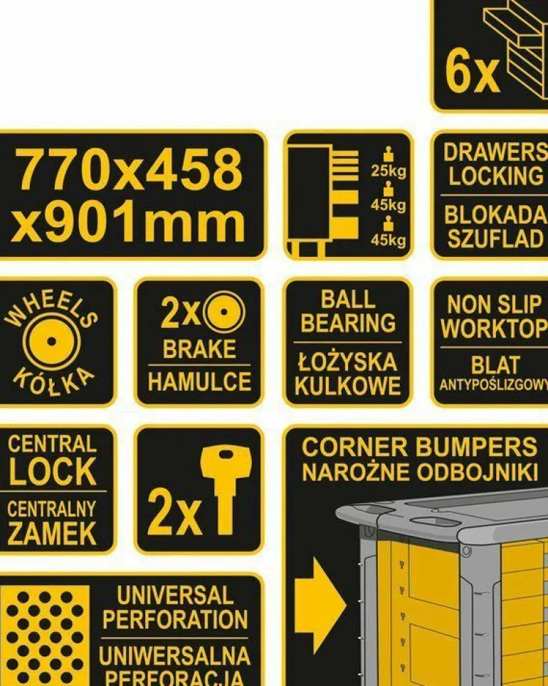 Szafka serwisowa posiada 6 szuflad na prowadnicach kulkowych.