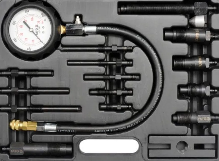 Zestaw zawiera miernik ciśnienia do 70 BAR (1000 PSI) z przewodem, szybko złączem i zaworem zwalniającym,