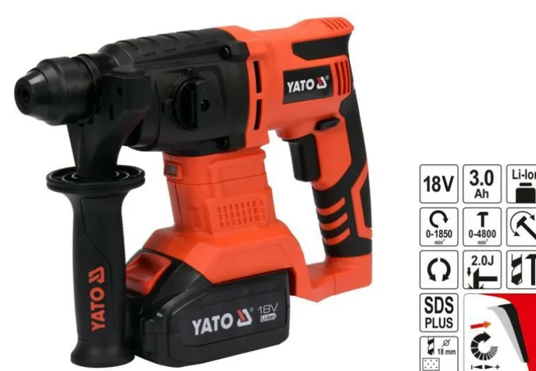Lekka i ergonomiczna akumulatorowa młotowiertarka SDS-plus YATO zfunkcją podkuwania.