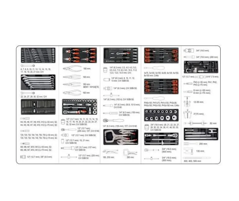 5 górnych szuflad zawiera 165 starannie dobranych narzędzi.