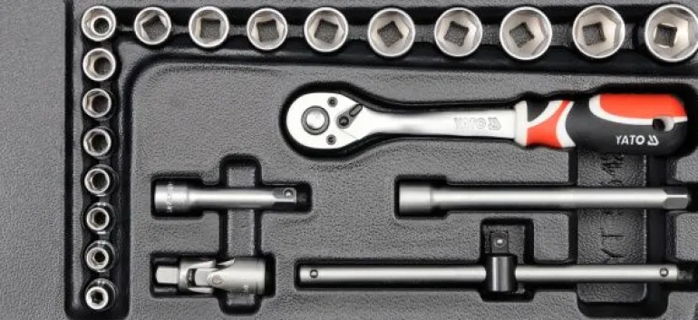 Zestaw narzędzi do szuflady 22 cz. – grzechotka, nasadki i akcesoria 3/8″ Yato.