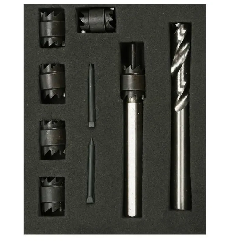 Zawiera 6 dwustronnych frezów koronkowych, uchwyt mocujący, 3 trzpienie ustalające oraz specjalne wiertło HSS 8 mm.