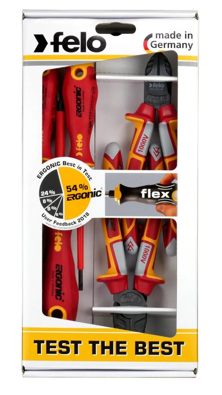 Poznaj niezastąpiony 5- częściowy zestaw dla elektryka, obejmujący: wkrętaki FELO Seria 400 VDE ERGONIC® oraz dwoje szczypiec VDE. Praca z nim gwarantuje najwyższy poziom bezpieczeństwa i komfortu!