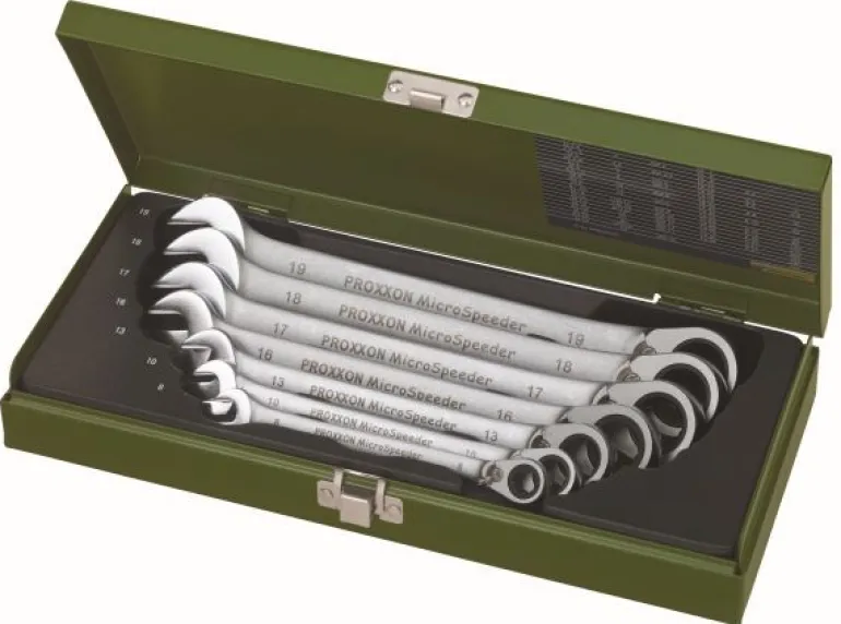 Zestaw profesjonalnych narzędzi PROXXON MicroSpeeder. Klucze od 8 – 19 mm. W skład zestawu wchodzi po sztuce SW: 8 – 10 – 13 – 16 – 17 – 18 oraz 19. Pakowane w stabilnej skrzynce metalowej.