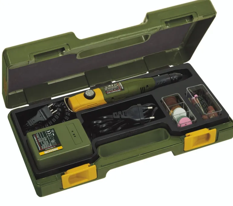 Zestaw zawiera: Wiertarko-frezarka Proxxon MICROMOT 60/EF, 43 przemysłowe frezy, 12 wierteł o jakości przyrządów stomatologicznych: 1 diamentowy sztyft szlifierski, 1 frez precyzyjny, mikrowiertła 0,5 i 1,0 mm, 1 szczotka mosiężna, 4 tarcze ścierne z korundu szlachetnego (cylinder, kula, tarcza i stożek), 4 tarcze ścierne (2 korundowe i 2 karborundowe), 1 filcowa, 20 tarcz tnących i trzpień, 6 zacisków MICROMOT od 1,0 – 3,2 mm, prostownik do 220 – 240 V (12 V, 1,0 A).