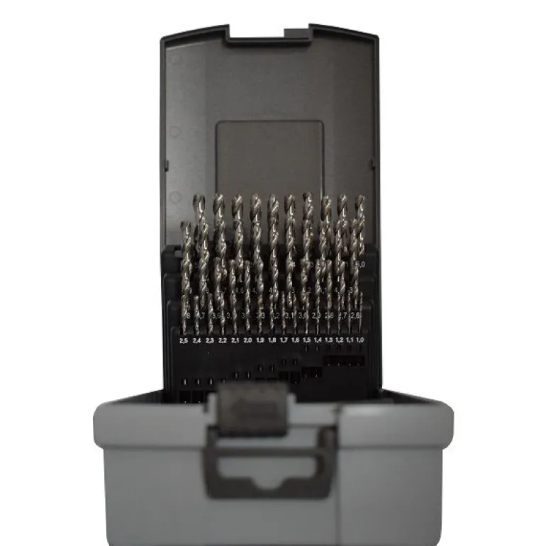 - Zestaw wierteł do metalu składający się z 50 frezowanych wierteł HSS-GS (wiertła spiralne HSS-G).