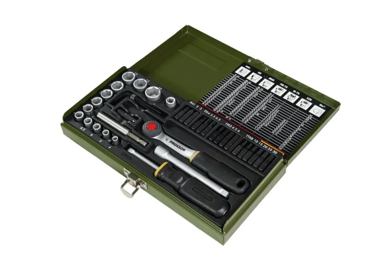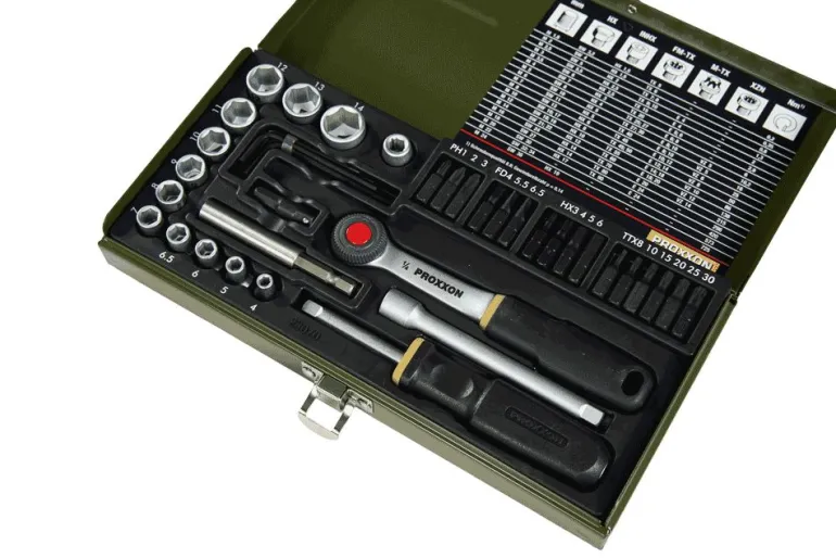 39-elementowy zestaw profesjonanych wkrętaków PROXXON z uchwytem magnetycznym. Zawiera nasadki (1/4″= 6,3 mm) w rozmiarach 4 – 14 mm, dodatkowo 16 bitów ze stali specjalnej, 1 adapter do połączenia sześciokąt/czworokąt (uchwyt magnetyczny/nasadka) i 1 adapter (inbus/czworokąt) do połączeń grzechotka/bit. Wygięte klucze imbusowe 1,25 – 1,5 – 2 – 2,5 i 3 mm. Pozostałe elementy widoczne na zdjęciu.